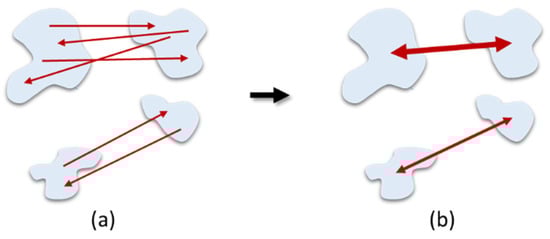 User activity generally exhibits correlations in space. As such, the user activity intensity in a specific geographic cell during a future period depends not only on its historical activity intensity, but also on the movements between other geographic cells [,]. If a person moves from one geographic cell to another between two instances of time, an interaction occurs between these geographic cells. This is the underlying assumption of edge construction via the GIF method. Here, we defined the interaction intensity as the number of people that moved between two geographic cells during a period, P. The weight of each edge was determined by their interaction intensity (Figure 3). The geographic interaction intensity formula can be expressed as follows: