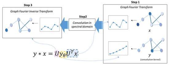 The core purpose of a GCN is to extract features by performing convolutional operations on graph data. As irregular graph data are not translationally invariant, it is impossible to perform convolution operations in the spatial domain. Bruna [] proposed a graph convolution for the spectral domain, which uses a Fourier transform to convert graph data from the spatial domain into the spectral domain for convolution operations. An inverse Fourier transform is then performed to convert the data back to the spatial domain (Figure 4).