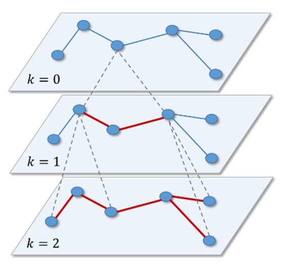 In the GCN described in Section 2.3.1, the number of parameters that must be learned is equal to the number of graph nodes. This can lead to high computational complexity and a strong tendency towards overfitting. To avoid these issues, we used the fast approximate graph convolution approach proposed by Kipf and Welling [], which removes the need to learn all node parameters. Instead, it considers only the first-order neighborhood of the nodes, and increases the size of the spatial domain’s receptive field by stacking multiple graph convolutional layers. Figure 5 illustrates the spatial-domain receptive field obtained by stacking two graph convolutional layers. The parameterized function of this simplified multilayer GCN has the following expression: