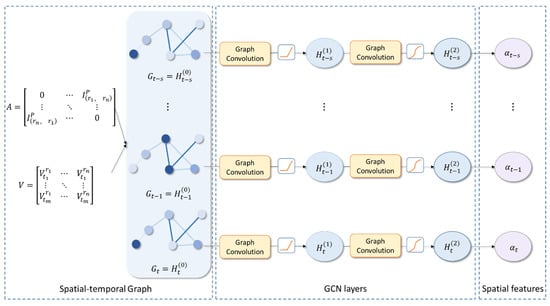 As oversmoothing will occur and dramatically reduce the training efficacy if the graph convolutional layers are stacked deeply [], we chose to use two graph convolutional layers for spatial feature extraction, i.e., k = 2 (Figure 6). The derivation of the expression that represents spatial-feature extraction by a k = 2 GCN is as follows: