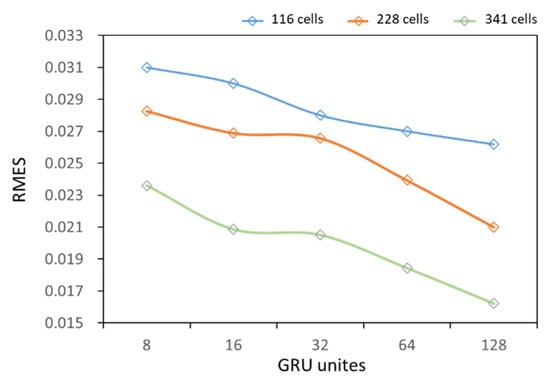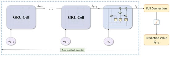 A GRU is a type of gated RNN; it is one of the most effective sequence modelers available []. In principle, GRUs are similar to LSTMs, as they both use gates to control their input and memory in solving the vanishing gradient in conventional RNNs. However, an LSTM has three gates, whereas a GRU only has two (the reset and update gates), which reduces the number of parameters, thus improving the learning efficiency. Hence, we used a GRU to capture the time-dependence of the spatio-temporal series (Figure 7). The predictions of the model are partially affected by the length of the input time steps. The prediction of some information in the next instant, based on the information in the s preceding time steps, can be expressed as follows: