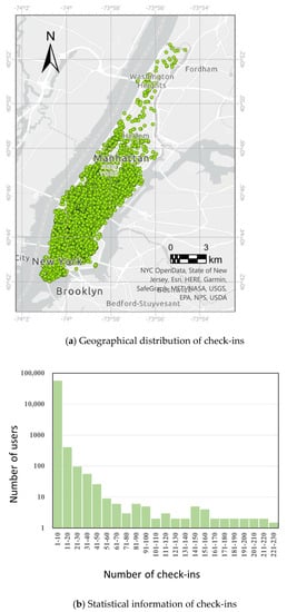 Social media check-ins record the location of a person dynamically. From this data, user preferences and habits can be extracted, and predictions of the spatio-temporal nature of the user activity intensity can be performed []. Here, we validated our method using a check-in dataset from the Manhattan borough of New York City (NY). The check-in dataset was collected from the Foursquare social media platform. The experimental dataset comprised 57,297 check-in records over 280 d, dated from 1 January, 2012 to 4 October, 2012. The raw data contained eight attributes, including check-in time, latitude, and longitude (Table 1). Figure 8 shows distribution and statistical information of the social media check-ins. Significant spatial features are present in the core check-in areas (Figure 8a). The number of users corresponding to the number of check-ins had a long-tailed distribution (Figure 8b). Low-frequency users dominated the check-in dataset. Hence, the check-in data used in this experiment adequately reflected the classic check-in behaviors of users [].