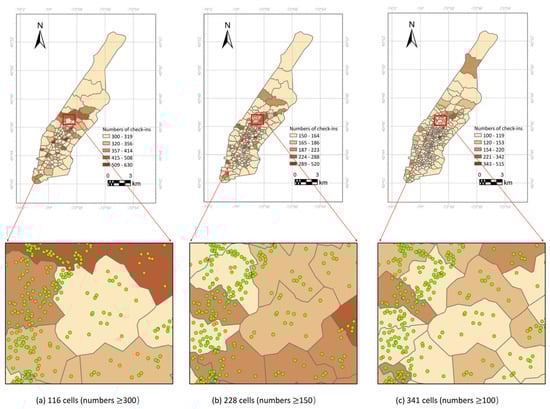 Three geographical unit partitioning schemes, depending on the minimum specified number of check-ins: (a) 116, (b) 228, and (c) 341 cells were obtained when the minimum number of check-ins was set to 300, 150, and 100, respectively.