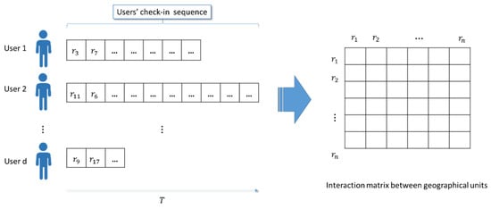 Computation of the geographic interactions of user movements. The user check-in sequences are constructed from their location records at different time intervals.