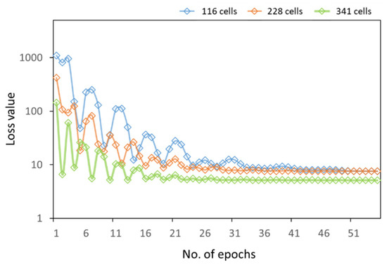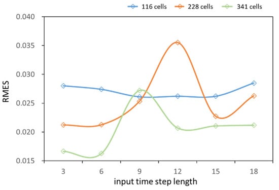 The experiments were carried out in Windows 10/64 bit/i7 processor and an 8G-memory hardware environment. The proposed GCN-GRU model was implemented with Python in TensorFlow. We set the ratio between the training and testing datasets to 4:1. The learning rate was set to 0.001 (as is conventional), and the batch size was set to 256, according to the bitrate of the graphics card in the experimental environment. The number of training epochs was set to 50. The loss of the model’s predictions decreased as the number of epochs increased (Figure 11), indicating normal convergence during training. As the number of hidden units in the GRU affects the performance and accuracy of the GGCN-GRU model, we calculated the RMSE and MAE for 16, 32, 64, 100, and 128 hidden units: they took the minimal values for 128 units in all three datasets (Figure 12). Therefore, we set the number of hidden units in the GRU to 128. Based on Section 2.4, the length of the GRU’s input time step affects predictions in the next time. Here, we investigated how the length of the time step affects the predictions by setting the input time step to 3, 6, 12, 15, and 18, and calculating the RMSEs (Figure 13). This revealed that the effects of the length of the time step on the RMSE differ among datasets. A short time step reduces the model’s ability to learn time-series data, whereas an excessively long time step leads to overlearning, thus reducing accuracy. For each dataset, we used the time step that yielded the minimum RMSE value (9, 6, and 6 for the datasets with 116, 228, and 341 geographic cells, respectively).