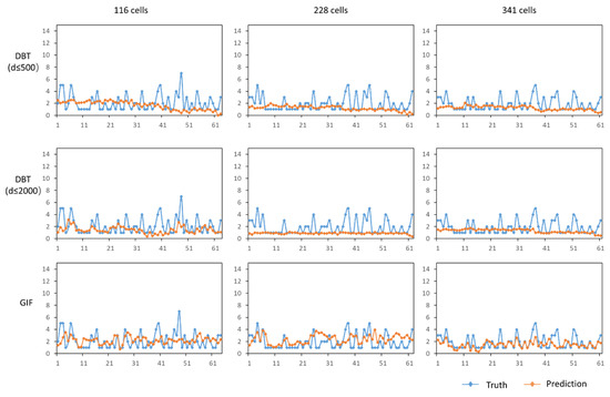 Figure 14 illustrates the predicted and true values obtained using DBT (at distances ≤ 500, 1000, and 2000 m) and GIF for certain geographic cells at different times. DBT, at the 500 m distance threshold, caused oversmoothing using all three datasets. The 500-m distance threshold resulted in limited connections to adequately describe the spatial features of the dataset. The accuracy of DBT, at the 2000 m threshold, decreased as the number of geographic cells increased. This is likely due to the large distance threshold, which caused the graph to have excessive connections, thus hindering the extraction of the valid spatial features. We can also conclude that the predictive accuracy of spatial adjacency methods strongly depends on the selection of an optimal distance threshold, which must be determined empirically using a large number of trials. As the fit of GIF is superior to that of the other methods in all three datasets, we can conclude that GIF can characterize spatial features while also being generalizable to different datasets. However, the peaks of the true values were poorly fitted, even when using the GIF method. This problem may be intrinsic to GCNs and the input data. In the frequency domain, the check-in data consists of low-frequency (low values) and high-frequency (high values) features. As the GCN acts like a low-pass filter, it excludes high-frequency information (high values) in the data and focuses on learning low-frequency information (low values), for which there are several valid features. This indicates that the filtering of high-frequency information by the GCN resulted in poor predictions of peaks and a “smoothened” range of predictions.