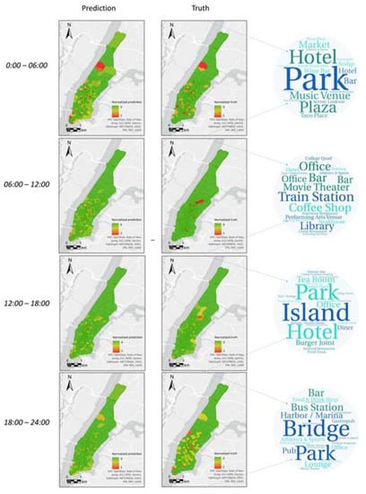 Figure 15 shows the true and predicted activity intensity of 341 geographic cells at four time intervals (dawn, morning, afternoon, and night). To provide a semantic explanation for user movements, we used the “frequency–inverse document frequency (TF-IDF) algorithm” [] to determine the significance (i.e., the importance, rather than statistical significance) of the local point-of-interest (POI) types in each geographic cell. The POI types of the check-in data can reflect the types of popular places in a region, which can explain why people like to visit a specific place. The significance of the POI types in a geographical unit reflects the preferences for the functional place-types. Although the number of check-ins for a given POI type can reflect place-preferences, it does not reflect the relationship between the place’s function and the local area. The TF-IDF algorithm is used to evaluate the importance of a word (or phrase) in a set of files (e.g., a set of articles). Words or phrases that appear frequently in one article and rarely in others are considered to have high utility for distinguishing between categories. In this study, we regarded the local area as a document and the entire research area as a document set when calculating the significance of the local POI types, as follows:
