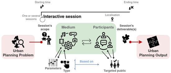 In all public domains, any approach that looks for citizens’ inclusion in decision-making implies a lengthy process []. However, the participatory process should not be regarded as an additional layer of complexity in policy-making, but as an essential step to co-design a political decision. This study focuses on public participatory approaches initiated by authorities in the context of urban planning problems. We illustrated the components that compose these processes in Figure 1. An interaction session happens at a fixed time at a set place (real or virtual), during which citizens and authorities exchange information through a medium. A single session is a part of a broader process that will generate deliverables (e.g., reports, indicators) for an urban planning problem. Each session has a specific scope that aims to address particular components of the overall problem. These separate steps aim at reaching a particular audience (i.e., the targeted public), that should be adequately represented by the participants of the session.