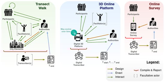 Schema from an actors’ interactions perspective of the three options (Transect walk, 3D online platform, and online survey) considered for this urban problem.
