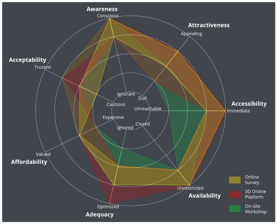 The six previous dimensions of access are described from a citizen/medium relation. These dimensions are also defined in the literature from the perspective of participants’ abilities []. Five abilities are categorized and bound to these dimensions of access: (1) the ability to reach, which involves self-mobility, is linked to the aspects of accessibility and availability; (2) the ability to pay, which regards the economic situation of the participant, is related to affordability; (3) the ability to seek is associated with acceptability and refers to personal freedom to select and adhere to the approach; (4) the ability to perceive is connected to awareness, and implies building intelligence and understanding regarding the interactive session; (5) the ability to engage, which fosters the opportunity to participate and the commitment to the approach, is coupled with adequacy. However, we argue that the dimension of adequacy does not entirely fulfill the ability to engage. Indeed, an adequacy that is optimized (in terms of timing, scope, and specific skills) does not ultimately result in the participation of the individual targeted by the authorities Concerns about user-friendliness and the appeal of the medium need to be taken into account. Therefore, we suggest translating these considerations into a seventh dimension of access that plays a vital role in the engagement of individuals, who are not only convinced by the project and the approach. This new dimension is the attractiveness of the interactive session, and, by extension, the attractiveness of the selected medium (Table 2).
