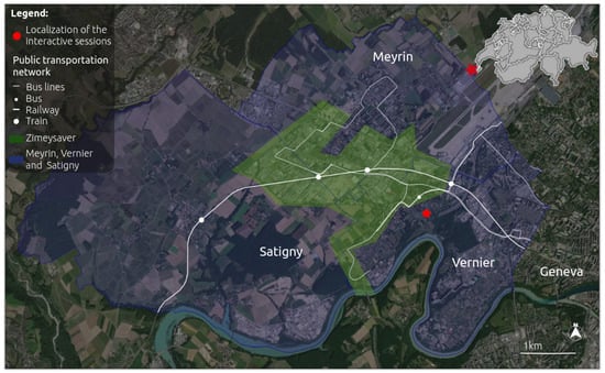 Two interactive sessions took place on 8 February and on 1 March 2018 from 6 p.m. to 9 p.m. The sessions were in line with a consultative level of participation [] and adopted an on-site workshop as a medium of interaction. The red dot in Figure 4 highlights the location of the meetings. This position is adjacent to the ZImeysaver and is located within the most populated of the three affected municipalities. A train station connected to the two other cities is within walking distance (10 min). A bus stop is also close to the meeting point (5 min). Around 30 parking spaces are available outside the event building.