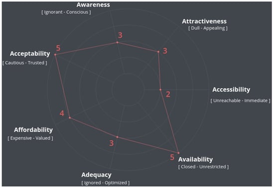 In experimental medical sciences, the concept of access is defined using six dimensions: (1) accessibility, the distance between the location of the service and the customer; (2) availability, the ratio between volume (needs) and resources (capacity); (3) adequacy, the fit of the service to the client; (4) affordability, the service cost for the client; (5) acceptability, the customer opinion about the service; (6) awareness, described as the publicity of the service (use, role, goals, user target, etc.) and the information monitoring [,]. In the next section, we transfer these dimensions to an urban interactive session point of view.