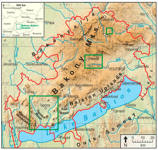 The Bakony–Balaton UNESCO Global Geopark (Figure 1) is founded and managed by Balaton Uplands National Park. It has been a member of the Global Geoparks Network (GGN) since 2012. It has an area of 3244 km2 and encompasses 151 settlements. Its area is mainly located in the Bakony Mountains. Since the Geopark has a geological history of 440 million years, its earth scientific and cultural heritage is internationally outstanding. Many brochures, educational trails and visitors’ centres help geotourists in gathering scientific and cultural information [,,].