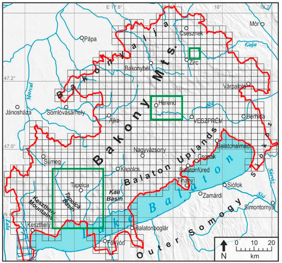 The sample area—Bakony–Balaton UNESCO Global Geopark—is located in the western part of Hungary, next to Lake Balaton, the largest lake in Central Europe. The 200 km long and 30–50 km wide Transdanubian Mountains cross through the Geopark, with an average elevation of 400–600 m. It is mostly built up by Mesozoic limestone and dolomite, with volcanic areas and karst horsts. Between the hills, basins are covered with Tertiary/Quaternary deposits. When strong tectonic forces were present, horsts, grabens and basins were formed by deflation that exhumed the basalt buttes of the area []. The highest parts of the Geopark are in the Bakony Mts. The amount of precipitation is in tight connection with the NE-SW direction of the mountains: the annual rainfall is around 600 mm in the NW parts and 500–600 mm in the SE parts. In a geomorphological context, the area is divided by distinct faults into smaller units with various attributions: lifted highlands (Keszthely Mts), horsts and grabens (Balaton Uplands, Northern Bakony) and carstic–basaltic undulated relief (Southern Bakony) also appear. Due to the accentuated surface, the vegetation cover shows great variability. In the sub-Atlantic Bakony Mts, beech woods are the most common due to the relatively large amount of rainfall. As the elevation decreases, oak and hornbeam woods become common. The sub-Mediterranean climate of the surrounding of Lake Balaton is good for chestnut and almond trees too [,].
