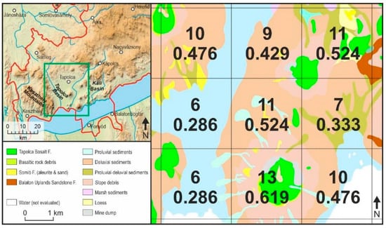 The geological sub-index was calculated using the 1:100,000-scale geological map of Hungary, cropped for the Geopark []. The sub-index was determined by counting the number of different lithostratigraphic units in each grid cell (Figure 3). For this, the geological vector layer was rasterised and the ‘Zonal Statistics’ geoprocessing tool’s ‘Variety’ attribute gave the different raster values (geological types) of each cell. After this, the normalisation formula was applied to get balanced sub-index values.