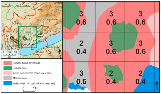 This sub-index was calculated by using ‘AGROTOPO 100’ [] that is a 1:100,000-scale soil map and digital database containing genetic soil classes. Using the different soil class occurrences in each cell, the sub-index was calculated in a way similar to the geological sub-index. After rasterization and running ‘Zonal Statistics’, the normalisation formula was applied (Figure 4).