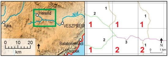 Hydrological index determined from the generated watercourse network, categorised using Strahler’s order (around Herend). The small digits are the stream hierarchical levels while the big ones are the hydrological indices of the corresponding cells.