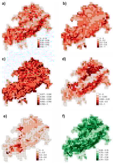 Each sub-index value set was visualised using the 2 × 2 km grid in QGIS. Five cluster groups were formed by ‘Natural Breaks’ method []—it minimises normal deviation between the elements of groups and maximises the difference between the groups. The distribution of geodiversity elements can be observed in the produced maps (Figure 7).
