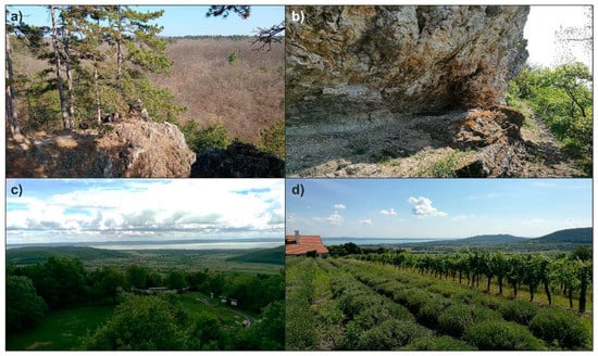 Some examples of geosites from high-geodiversity areas: (a) Koloska Cliffs in the Balaton Uplands near Balatonfüred; (b) a key section in the Tihany Peninsula near Sajkod; (c) panorama of Lake Balaton from the lookout tower of the Mencshely Volcano Educational Trail and (d) panorama with lavender and vineyards from Aszófő.