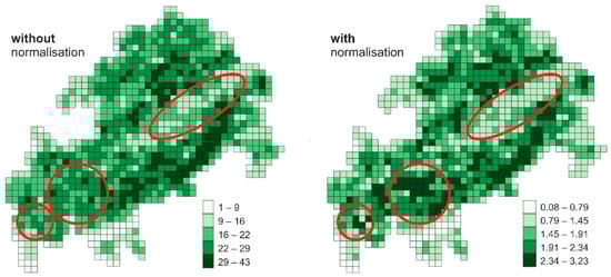 This unbalanced situation is mostly caused by the various scales and different types (vector, raster, DEM, formation descriptions) of base data. Accordingly, this kind of error can occur anywhere in the world where datasets from various sources are used for geodiversity assessment. The difference between the two methods is visible in the geodiversity maps generated from the two types (raw and normalised) of indices (Figure 9).
