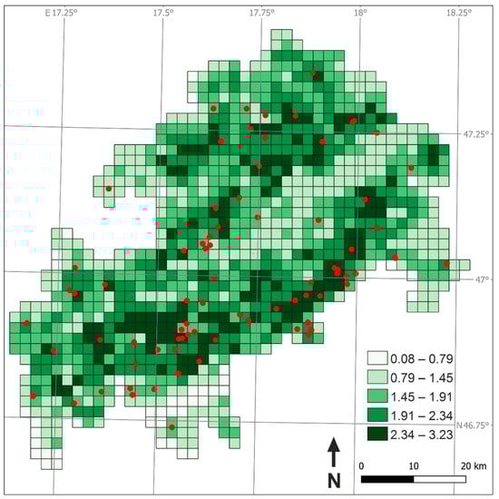 This sub-index was also determined with the help of the geological map and the formation description booklets [,,], as there were no medium-scale thematic maps available. The following elements were searched and written in the database in case of each geological formation polygon: (1) precious stones—e.g., diamond, gold, silver; (2) metallic minerals—e.g., lead, copper, manganese; (3) industrial minerals—e.g., quartz sand, calcite, bauxite, gypsum; (4) geological energy sources—e.g., lignite, oil shale, natural gas; (5) mineral waters and springs. In each cell, we counted all the different elements (enumerated before) and considered their number as the sub-index. The maximum number of different mineral elements in a cell was 5 and the minimum was 0. The average number of mineral elements in the cells was 0.68. The values were also normalised.