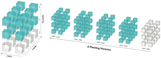 Conceptual diagrams of four GCMs combined with two RCPs, three SLR percentiles projections and five planning horizons. Each cube represents one specific climate scenario. Some cubes are colored blue to illustrate sequential modeling of flooding scenarios. The diagram illustrates the four dimensions of 120 coastal flooding scenarios used in this study.