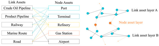 After the connection was validated for each pair of node and link assets, we constructed a network model that was able to capture the interconnections within the fuel transportation networks. In this study, a multimodal fuel transportation network was constructed as a directed graph using NetworkX, which is a Python package for the creation, manipulation, and study of the structure, dynamics, and functions of complex networks [44]. In NetworkX, the structure of a network, or graph, is encoded in the links (connections, edges, arcs) between nodes (vertices). It provides basic network data structures for the representation of simple graphs, directed graphs, and graphs with self-loops and parallel edges [44]. The node and link infrastructure assets previously collected were loaded as inputs into NetworkX. The link asset types were first mapped in topographic form and then inserted into the graph as subnetwork layers with nodes and links. The nodes within these subnetworks represent the vertexes of line infrastructure segments (e.g., connection points between pipeline segments). The direction of each link follows the fuel supply logic from upstream to downstream. For example, the road network layer consists of intersections represented as nodes and road segments represented as links. Next, the node assets were inserted into the graph connecting different link asset layers following the relational diagram in Figure 4. For example, the refinery connects four different link asset layers/subnetworks, namely, crude oil pipeline, product pipeline, railway, and road. Table A1 shows five types of line assets in their original data format, geographic representation, and topographic representation (graph). Detailed documentation of this process is summarized in Table A2.