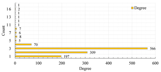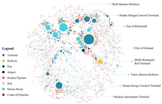 The final multimodal fuel transportation network in the study area has 1455 nodes and 1797 links. The average node degree (where the degree of a node equals the number of edges connected to the node) is 2.74 and the average path length (the average path length is defined as the average number of steps along the shortest paths for all possible pairs of network nodes; this is a measure of the efficiency of information within a network) is 14.75. Most nodes have a relatively low degree (fewer than four), yet a small number of nodes have a degree greater than ten, with 17 the maximum (Figure 5). From a network science perspective, nodes with higher degrees are generally considered “hubs” within the network. Figure 6 shows a topologic visualization of the multimodal network where the hubs within the network are individually identified. It is evident that terminals (BNSF rail terminal, Kinder Morgan Concord terminal, Nustar Energy Crockett terminal, and Buckeye Sacramento terminal), refineries (Valero Benicia refinery and Shell Martinez refinery), and ports (Port of Richmond and Port of Oakland) have more connections than other nodes within the network. This result aligns well with knowledge gained from stakeholder interviews [22]. Terminals and ports are critical assets to the operational success of the fuel transportation network because they connect crude oil supply (upstream to midstream) to refined fuel products’ distribution (midstream to downstream). Refineries are the central nodes in the fuel supply–demand chain because they connect upstream supply to downstream demand. Each drop of crude oil must pass through the refining process before it reaches consumers.