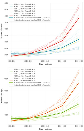 At the regional level, the impact of coastal flooding on the multimodal network was first measured by evaluating the number of nodes and links that are directly exposed. Figure 7 shows the result of node and link exposure across five time horizons. Overall, we observe an uprising exposure pattern across both node and link assets over time. The RCP 8.5 scenarios have relatively larger exposure profiles than RCP 4.5 scenarios. Given the same RCP, the 95th and 99.9th percentile sea level rise scenarios have a relatively larger impact than the 50th percentile scenario. Furthermore, the variation in hazard exposure for both node and link assets to coastal flooding also increases over time and is smaller for the first two time horizons and larger for the following three time horizons.