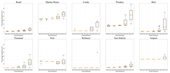 Exposure of node and link fuel infrastructure assets to coastal flooding under 120 climate scenarios. The top row displays boxplots of link asset types’ exposure profiles in terms of percentage inundation and the bottom row displays boxplots for node asset types.