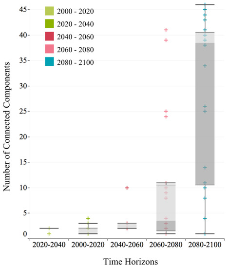 The percentage of nodes and links that are impacted by different coastal flooding scenarios were also calculated and categorized according to the type of asset they represent (Figure 8). On average, link assets have greater exposure to coastal flooding compared with node assets. Among all asset types, product pipelines have a higher percentage of hazard exposure, whereas refineries have a relatively lower percentage exposure. When compared across different time horizons, all asset types experience a higher percentage of flood hazard exposure towards later time horizons. The variation of exposure (within the same time horizon) increases over time due to the uncertainties in future climate projections. A similar pattern can also be observed for the count of the number of connected components, in which the potential variation resulting in a fragmented network after disturbance by coastal flooding dramatically increases in later time horizons (Figure 9). In particular, in the first time horizon (2000–2020), the network generally remains as one fully connected network. However, in later time horizons, the total number of connected components within the multimodal network and its variation within the given time horizon starts to increase. This result suggests that, due to coastal flooding, the multimodal network becomes increasingly fragmented over time with increasing variation. Such a result is to be expected because short-, mid-, and long-term impacts of climate-change-induced extreme weather events, namely, coastal flooding, were not fully accounted for when the fuel transportation network was first designed.