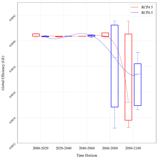 Changes in network global efficiency over five time horizons grouped by RCP 4.5 and RCP 8.5 scenarios. A second-order polynomial is used to achieve a linear fit line demonstrating the overall trend in global efficiency.