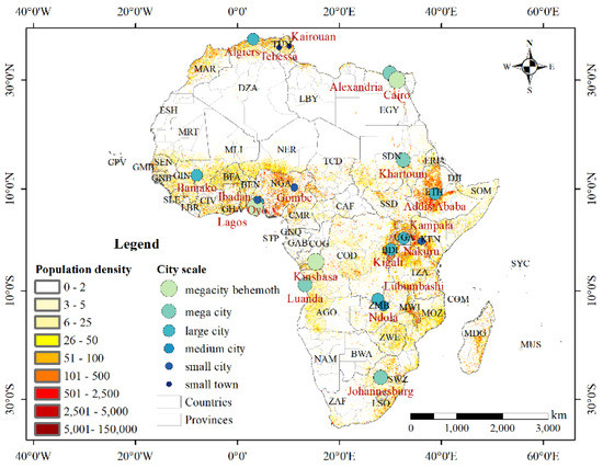 The total area of Africa is about 32 million km², which includes 55 countries or regions, with a total of 751 provinces. In 2018, the urbanization level of Africa was 43%, with 547.6 million people living in cities [1]. Twenty African cities were selected to verify the feasibility of the methods used in our study, and their geographical locations are presented in Figure 1. According to the corresponding urban population in 2018 and the classification standards of [25] and [1], these 20 cities can be divided into six categories, and the detailed information is shown in Table 1. The selection of cities for evaluation is in line with randomness.