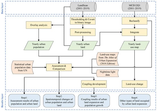 Four main procedures were undertaken to identify spatiotemporal characteristics of urban land expansion and population growth in Africa. Firstly, urban land and urban population were generated using LandScan data with thresholding method and overlay analysis. Secondly, we assessed the accuracy of urban land and urban population obtained from the first step. Thirdly, elasticity coefficient was adopted to detect the coupling development between urban land expansion and population growth. At last, the reclassified MCD12Q1 land-use data were integrated with the acquired urban land to study the urban land-use change (Figure 2).