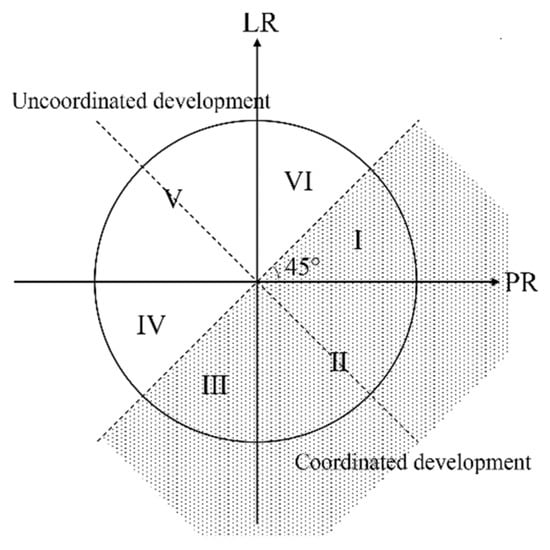 According to the increase and decrease changes of and and the numerical comparison, the coupling relationship between urban population and urban land can be divided into six types. The illustration can be seen in Figure 3 and Table 2. Taking type I as an example, PR and LR are positive at the same time, and the former is greater, indicating that urban population and urban land increase at the same time and the growth of urban population is faster than that of urban land. Based on the numerical comparison between and , the six coupling types can be divided into two categories: coordinated and uncoordinated development. Detailed information is shown in Table 2.