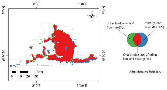 Overlapping diagram of urban land generated from LandScan and built-up land from MCD12Q1: taking Lagos in 2019 as an example.