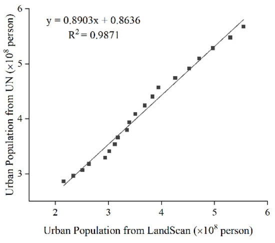 To verify the accuracy of the urban population generated from LandScan in this study, statistical urban population from the UN was used for comparison. Linear regression analysis was applied to the two datasets and the comparison result is shown in Figure 5. The results show that the urban population obtained from LandScan has a linear correlation with the statistical urban population of UN, with the R2 reaching 0.9871. At the same time, the linear correlation coefficient is 0.8903, which is close to 1. As a result, the urban population generated from LandScan has a strong relationship with that from the UN.