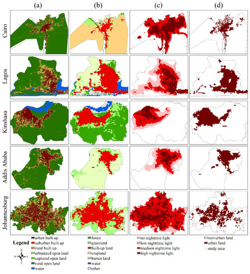For urban land generated from LandScan, we verified it from both qualitative and quantitative perspectives. Figure 6 depicts the qualitative comparison of urban land generated from LandScan (Figure 6d) with land use maps from The Atlas of Urban Expansion (2016 Edition) (Figure 6a) and MCD12Q1 (Figure 6b), and spatial distribution maps of nighttime light types (Figure 6c). It is obvious that the spatial distribution of urban land generated from LandScan is similar to the urban built-up from The Atlas of Urban Expansion (2016 Edition) and built-up land from MCD12Q1. As for the distribution of nighttime light types, the urban land generated from LandScan was not completely covered by the high nighttime light, except for Cairo. However, the shape of high nighttime light distribution is very similar to that of urban land. This also supports demographers’ views that urban transformation in Sub-Saharan Africa can be better interpreted as a demographic phenomenon rather than a strictly economic one [35,36].