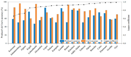To better verify the urban land generated from LandScan, 20 cities were selected to conduct the accuracy assessment. The accuracy was evaluated by the ground true land-use map collected from The Atlas of Urban Expansion (2016 Edition). The kappa coefficient, producer’s accuracy, and user’s accuracy of 20 cities are shown in Figure 7. The kappa coefficient ranges from 0.66 to 0.99. The user’s accuracy in all cities is higher than 60%, and some even reach 96%, except for Gombe. Meanwhile, the producer’s accuracy of the 19 cities is higher than 50%, and the highest is 86%. The derived urban center in LandScan is smaller than the ground truth data, which includes most artificial impervious areas and associated infrastructures, parks, lakes, and so on within the urban boundary [37]. Additionally, the spatial resolution of LandScan is 1 km, which is much coarser than that of the ground truth data (30 m). As a result, we think the method used in this study is reasonable and can be effectively implemented.