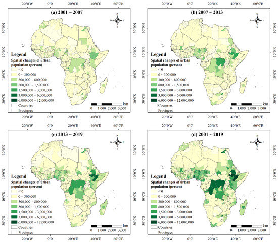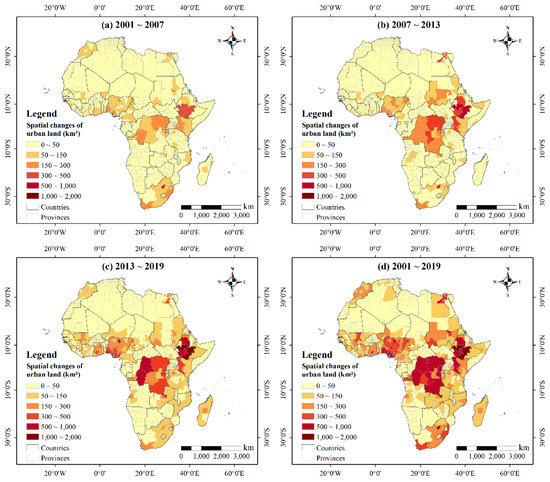 In order to explore the spatial development dynamics and distribution pattern of urban land expansion and population growth in Africa from 2001 to 2019, the spatial distribution of urban land and urban population growth in African cities from 2001 to 2007, 2007–2013, 2013–2019, and 2001–2019 are presented on the vector map of provincial administrative divisions (Figure 9 and Figure 10).