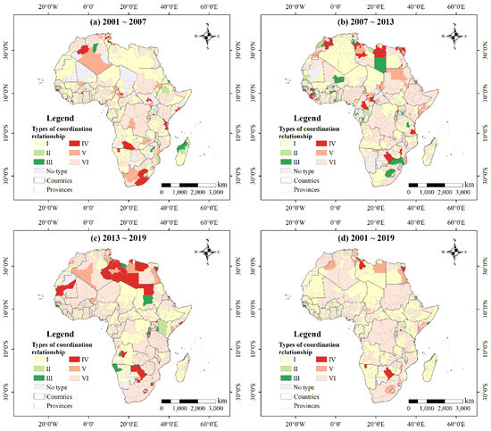 From 2001 to 2019, the coupling relationship index of urban population and urban land was 0.76. In general, the growth rate of urban land was greater than that of the urban population in Africa, and the type of coupling relationship was in type VI.