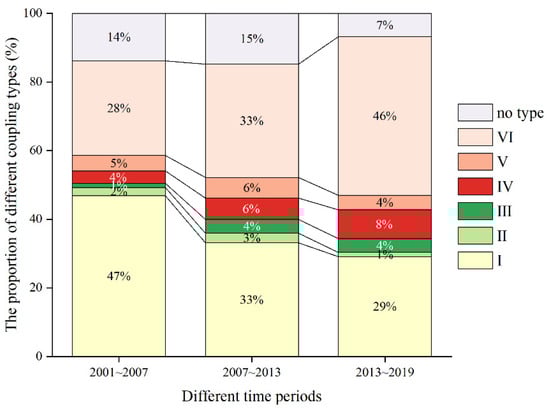 We counted the proportion of urban development types in different periods, and the results are displayed in Figure 12. According to the change of the proportion of different types of cities over time, type VI was increasing, while type I was decreasing. The total proportion of uncoordinated development types (IV, V, and VI) was getting higher and higher. Therefore, the balance of urban land expansion and population growth in Africa is not optimistic. Among them, type VI represents the synchronous growth of urban population and urban land, and the growth of urban land is faster than that of population, which indicates that most provinces are still in the stage of rapid urbanization, and it is speculated that the imbalance of urban land expansion and population growth will continue or even intensify in the future.