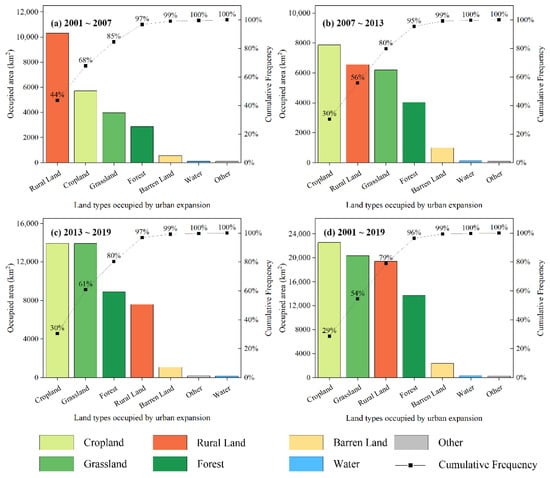 Pareto chart of other land types occupied by urban expansion in different periods.