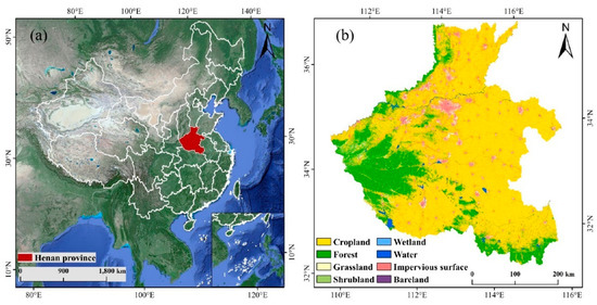 (a) Location and (b) Spatial pattern of the land type of Henan Province, PRC.