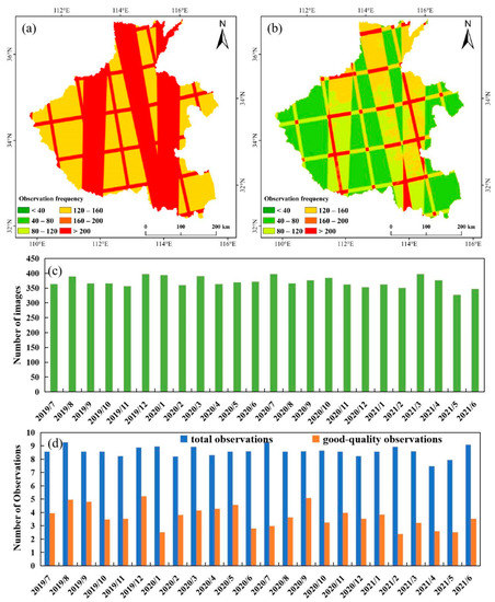 We collected a total of 8883 images in the Henan Province during the study period (1 July 2019–1 July 2021). After preprocessing the image according to the above steps, we counted the total observations and good-quality observations of each pixel in the Henan Province, respectively (Figure 2a,b). Most pixels had >120 total observations and >40 good-quality observations in the Henan Province. Moreover, we counted available images for the study (Figure 2c) and observations per pixel in the Henan Province every month (Figure 2d). During the study period, there were >300 images per month, and the total observation and good-quality observations of each pixel were more than 7 times and 2 times per month, respectively.
