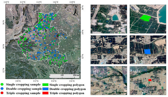 (a) is the spatial distribution of sample points. (b1—d1) are samples of different cropping intensities. (b2–d2) areas generated by the samples. (b1) and (b2), (c1) and (c2), (d1) and (d2) correspond to b, c, d in (a), respectively. Image source: Image 2021 Maxar Technologies and 2021 CNES/Airbus. Image date: Identified in the picture. Color composite: RGB (red, green, blue).