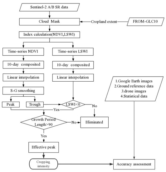 From the selected classification approaches, it can be roughly divided into: (1) image-based spatial statistics and (2) pixel-based temporal statistics. Regarding (1), previous studies extracted cropping intensity based on the differences in the spectrum [28] or vegetation index (VIs) [29,30] in a specific time window, which can best reflect the growth characteristics of the crops. This classification approach needs to collect a wide range of training samples, which not only consumes a lot of time and manpower, but also the quantity and quality of sample points have a great impact on the classification accuracy. Furthermore, due to the influence of atmosphere, clouds, cloud shadow, etc., it is difficult to obtain crop growth characteristics accurately. Regarding (2), this approach generates a cropping intensity map using rule-based algorithms based on constructed time series datasets of VIs [31,32,33,34]. These VIs include the normalized difference vegetation index (NDVI) [14,35], enhanced vegetation index (EVI) [36,37], land surface water index (LSWI) [16], and modified normalized difference water index (mNDWI) [38,39]. This approach is based on the crop phenological characteristics recorded in the VIs’ time series. By analyzing the life cycle of the crop, the temporal metrics of crops are obtained, and the classification rules are generated [39,40,41].