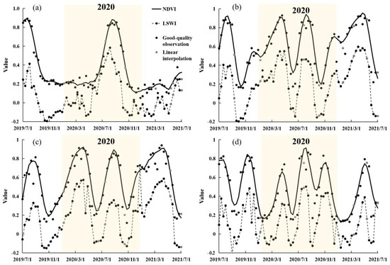 Temporal profile of NDVI and LSWI indices for cropping intensity sample sites with (a) single cropping (114.7136° E, 32.0998° N), (b) double cropping (115.0976° E, 34.1655° N), (c) double cropping (114.7069° E, 32.4664° N), and (d) triple cropping (115.2695° E, 33.8918° N).
