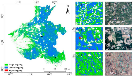 We obtained the reference datasets from three aspects to verify the classification results of this paper. Firstly, based on the Google Earth images with 1 m spatial resolution, the stratified random sampling method was used to obtain single, double, and triple cropping validation samples sets. Secondly, during the period from March to June 2020, we carried out seven field works in Zhengzhou City, Xinxiang City, Kaifeng City, Anyang City, Hebi City, Shangqiu City, Zhoukou City, Xuchang City, Luohe City, and Xinyang City in the Henan Province and collected geo-referenced field photos of different cropping intensities. These field photos include main planting systems such as double cropping of wheat-corn rotation, single cropping of rice, and triple cropping of vegetable. In addition, during field works, we used drones to obtain multispectral images, which were used as auxiliary data in visual interpretation. The spatial resolution of these multi-spectral images can reach 0.1 m, which clearly shows the different planting systems of the land. Finally, we obtained a total of 1219 samples for single cropping, 2131 samples for double cropping, and 22 samples for triple cropping (Figure 3a).