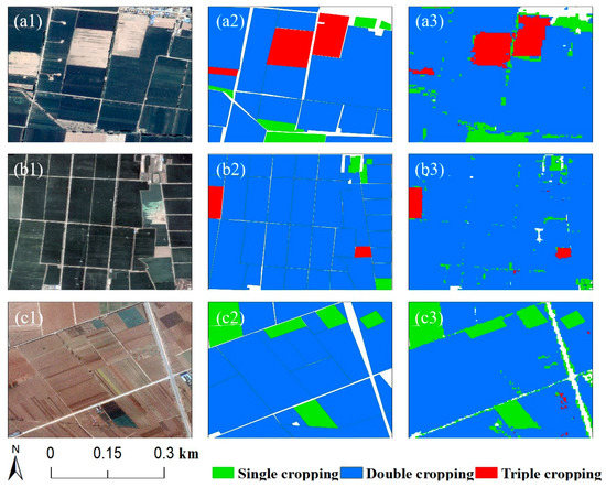 Accuracy evaluation of the results of cropping intensity classification based on the composite image of the study area. (a1–c1) are Google Earth images; (a2–c2) are ground reference data generated by visual interpretation combined with survey data; (a3–c3) are results in this study. Image source: Image 2021 CNES/Airbus. Color composite: RGB (red, green, blue).
